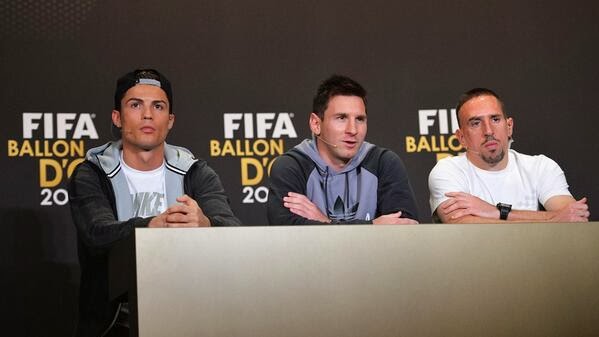 | Ballon d’or Finalists: Cristiano Ronaldo, Lionel Messi and Franck Ribery at the award Press Conference earlier. |