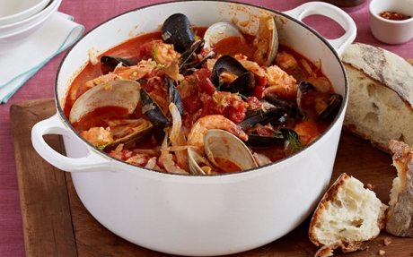 Add the clams and mussels to the cooking liquid. Cover and cook until the clams and mussels begin to open, about 5 minutes. Add the shrimp and fish. Simmer gently until the fish and shrimp are just cooked through, and the clams are completely open, stirring gently, about 5 minutes longer (discard any clams and mussels that do not open). Season the soup, to taste, with more salt and red pepper flakes.