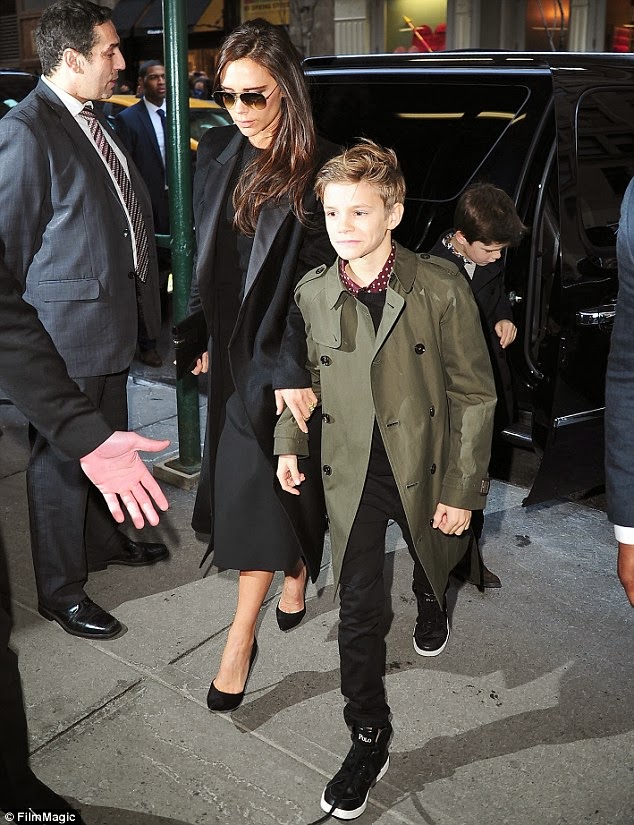 | Uber Stylish Pair: Victoria and her son Romeo( who featured in a Burberry campaign, looks trendy in a Burberry trench-coat) walk in to lunch |