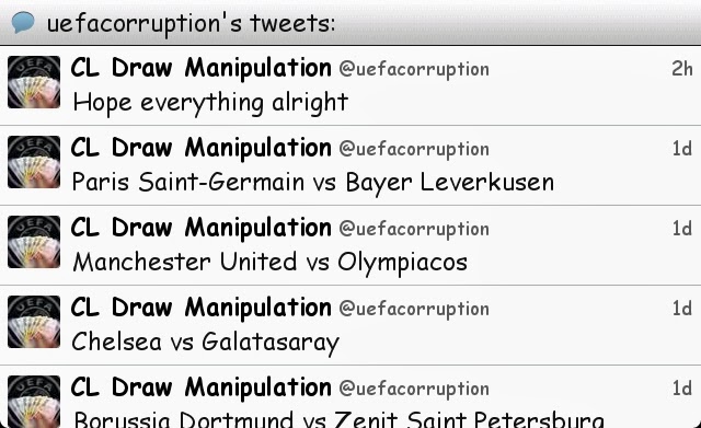 After the UEFA Draws results were announced, I saw someone re-tweet some tweets that were posted by someone(some people) whose handle was @uefacorruption on twitter. what amazed me was that the person supposedly tweeted predictions of the draws correctly for every club, 1 day before the draws were announced. see the tweets below: